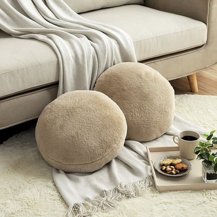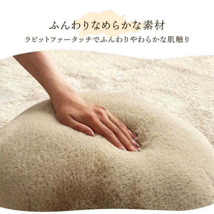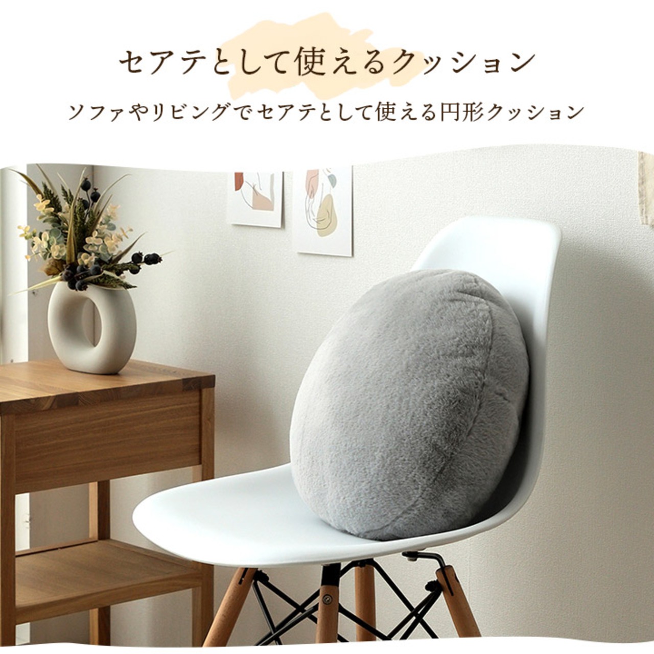 ラビットファータッチでふんわりやわらかな肌触の、ソファやリビングでご使用いただける円形クッションです。