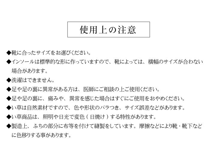 い草を使用したインソールです。い草の消臭効果・湿度調整機能で、蒸れを抑え、臭いを消臭する効果があります。革靴やスニーカーなどにもおすすめです。サイズは22cmから27cmまでご用意しています。