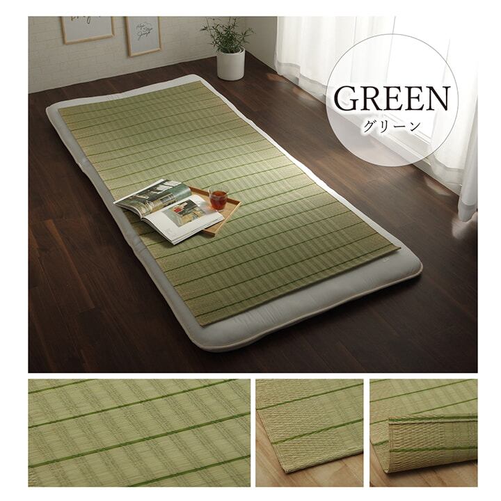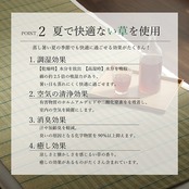 国産(九州産)のい草を使用したネゴザ(寝ござ)です。一本一本が太く、表皮が厚く繊維がキメ細かいので、弾力性があり、耐久性に優れています。い草には1.綿の約2.5倍の吸湿性があり汗のじめじめを軽減します。2.湿度の調整作用があり、蒸れにくく快適な就寝を促します。3.汗のにおいの元となる化学物質を90%以上抑え、においを軽減します。などの効果があります。また、ヒバエッセンス加工を施しています。(抗菌・防臭効果)