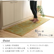 フルーツ柄のかわいらしい、い草のキッチンマットです。キッチンマットの不満を解消してくれる商品です。化繊もののキッチンマットと比べ、汚れにくくシミになりにくいです。小さなゴミでも、ほうきで掃く、掃除機をかけるだけで取り除くことができます。燃えにくい性質の素材のため火を使うキッチンでも安心してご使用いただけます。い草自体が持つ油分により汚れを弾くので洗う必要がなく長くご使用いただけます。裏地には国産のウレタンフォームを使用することで、丈夫でクッション性があり滑りにくくしました。キッチンに限らず様々な場所・シーンでお使いいただけます。