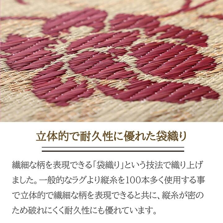 一般的ない草ラグよりも使用するい草の本数が多いため、繊細な花柄が表現でき気品あふれるデザインになっています。