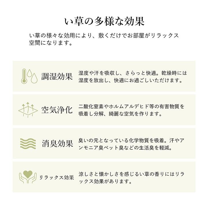 い草には空気の自然浄化作用、湿度の調節作用があり、汚れにくいといった特徴があります。