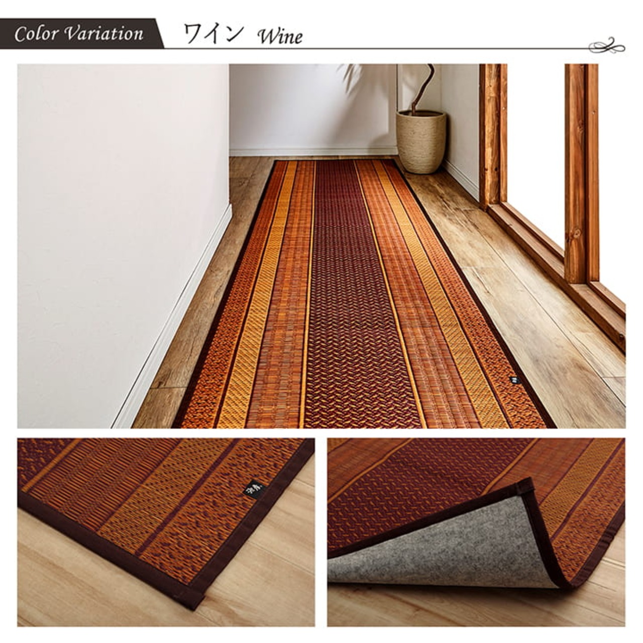 現代のライフスタイルに合う、洗練されたモダンなデザインの廊下敷きです。国産(九州産)のい草を使用しています。一本一本が太く、表皮が厚く繊維がキメ細かいので弾力性があり、耐久性に優れています。い草には空気の自然浄化作用、湿度の調節作用などがあります。また汚れにくく、使用するうちに黄金色に変化し味が出ます。い草に青森ヒバ加工を施しています。(抗菌、防臭効果)裏にはフローリングを傷つけにくいよう不織布を貼っています。