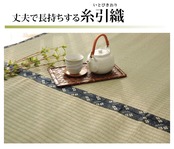 上敷きを敷くだけで畳のお部屋をリフレッシュ出来ます。日焼けしてしまった畳のリフレッシュに、新品の畳を汚さないためのカバーにご使用下さい。長さ120cm以上の長い国産(九州産)い草を使用しています。そのうち約88cmを使用しています。ヘリ際の白い部分が少ない、長いイ草を使用した高級な商品です。(白い部分は日焼けではありません、い草の根元と先端部分の色です。)い草は長いものほど高級になります。い草は先端部分が赤茶色く、根元が白く真中が青(緑)色です。真中の良質な青の部分を多く使用するほど、丈夫で綺麗な仕上がりとなります。またイ草は使用するうちに日焼けをしますが、真中の青の部分を多く使用したものほど、全体が綺麗にムラなく日焼けし、味が出ます。こちらの商品は畳表と同じ織り方の糸引織で仕上げました。双目織りと比べて、い草の打ち込み本数が多いため丈夫です。表面が滑らかなので、ホコリなどがたまりにくいのが特徴です。長くご使用されたい方や、耐久性をお求めの方には糸引織をおすすめします。国産(九州産)のい草を使用しています。国産い草は一本一本が太く、表皮が厚く繊維がキメ細かいので弾力性があり、耐久性に優れています。い草には空気の清浄化作用、湿度の調節作用があり、汚れにくいといった特徴があります。い草に青森ヒバ加工を施しています。(抗菌、防臭効果)表裏の両面が使えて経済的です。