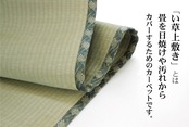 熊本県八代産減農薬栽培イ草100%使用の上敷きです。特徴として【①一般のイ草に比べ耐久性や弾力性に優れイ草特有の青さも長持ちします。②日焼けして退色が進んでもきれいなアメ色へと変化します。③大気汚染の原因にもなっている二酸化窒素を吸収する能力があり、またお部屋の湿度調整にも優れた働きをします。】上敷きを敷くだけで畳のお部屋をリフレッシュ出来ます。日焼けしてしまった畳のリフレッシュに、新品の畳を汚さないためのカバーにご使用下さい。通常畳表に使用される長さ130cm以上【JAS1クラス(畳表の中でも上クラス)】の国産(イ草の産地熊本県八代産)い草を使用しています。厳選された良質の太く長いイ草を高密度に織り込んでおりますので、丈夫で耐久性があり、素肌に心地よいボリューム感があります。長さ130cmのうち約88cmを使用しています。ヘリ際の白い部分が少ない、長いイ草を使用した高級な商品です。(白い部分は日焼けではありません、い草の根元と先端部分の色です。)い草は長いものほど高級になります。い草は先端部分が赤茶色く、根元が白く真中が青(緑)色です。真中の良質な青の部分を多く使用するほど、丈夫で綺麗な仕上がりとなります。またイ草は使用するうちに日焼けをしますが、真中の青の部分を多く使用したものほど、全体が綺麗にムラなく日焼けし、味が出ます。こちらの商品は畳表と同じ織り方の糸引織で仕上げました。双目織りと比べて、い草の打ち込み本数が多いため丈夫です。表面が滑らかなので、ホコリなどがたまりにくいのが特徴です。長くご使用されたい方や、耐久性をお求めの方には糸引織をおすすめします。国産(熊本県八代産)のい草を使用しています。国産い草は一本一本が太く、表皮が厚く繊維がキメ細かいので弾力性があり、耐久性に優れています。い草には空気の清浄化作用、湿度の調節作用があり、汚れにくいといった特徴があります。青森県のヒバの木から抽出した「ヒバエッセンス」をメーカー独自の技術で生地表面に加工しました。ヒバエッセンスにはヒノキチオールという、天然物質としては極めて抗菌性の高い成分が含まれています。(無加工品に比べ抗菌、防臭効果があります。)表裏の両面が使えて経済的です。※自然素材であること、また職人が一つ一つ手作業にて加工を行うため、形状のバラツキや表示サイズと多少異なることがあります。ご了承下さい。