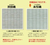 熊本県八代産減農薬栽培イ草100%使用の上敷きです。特徴として【①一般のイ草に比べ耐久性や弾力性に優れイ草特有の青さも長持ちします。②日焼けして退色が進んでもきれいなアメ色へと変化します。③大気汚染の原因にもなっている二酸化窒素を吸収する能力があり、またお部屋の湿度調整にも優れた働きをします。】上敷きを敷くだけで畳のお部屋をリフレッシュ出来ます。日焼けしてしまった畳のリフレッシュに、新品の畳を汚さないためのカバーにご使用下さい。通常畳表に使用される長さ130cm以上【JAS1クラス(畳表の中でも上クラス)】の国産(イ草の産地熊本県八代産)い草を使用しています。厳選された良質の太く長いイ草を高密度に織り込んでおりますので、丈夫で耐久性があり、素肌に心地よいボリューム感があります。長さ130cmのうち約88cmを使用しています。ヘリ際の白い部分が少ない、長いイ草を使用した高級な商品です。(白い部分は日焼けではありません、い草の根元と先端部分の色です。)い草は長いものほど高級になります。い草は先端部分が赤茶色く、根元が白く真中が青(緑)色です。真中の良質な青の部分を多く使用するほど、丈夫で綺麗な仕上がりとなります。またイ草は使用するうちに日焼けをしますが、真中の青の部分を多く使用したものほど、全体が綺麗にムラなく日焼けし、味が出ます。こちらの商品は畳表と同じ織り方の糸引織で仕上げました。双目織りと比べて、い草の打ち込み本数が多いため丈夫です。表面が滑らかなので、ホコリなどがたまりにくいのが特徴です。長くご使用されたい方や、耐久性をお求めの方には糸引織をおすすめします。国産(熊本県八代産)のい草を使用しています。国産い草は一本一本が太く、表皮が厚く繊維がキメ細かいので弾力性があり、耐久性に優れています。い草には空気の清浄化作用、湿度の調節作用があり、汚れにくいといった特徴があります。青森県のヒバの木から抽出した「ヒバエッセンス」をメーカー独自の技術で生地表面に加工しました。ヒバエッセンスにはヒノキチオールという、天然物質としては極めて抗菌性の高い成分が含まれています。(無加工品に比べ抗菌、防臭効果があります。)表裏の両面が使えて経済的です。※自然素材であること、また職人が一つ一つ手作業にて加工を行うため、形状のバラツキや表示サイズと多少異なることがあります。ご了承下さい。