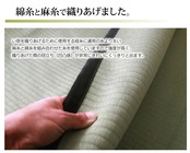 見た目の美しさと耐久性にこだわり抜いた上敷きです。経糸に麻糸と綿糸を使用し、通常の糸引織の2倍の糸量を使用しています。麻糸と綿糸を合わせることで糸自体が非常に丈夫になります。また一本一本が太くなるため、織り上げた際にはっきりと織りの凹凸が出て非常に綺麗です。上敷きを敷くだけで畳のお部屋をリフレッシュ出来ます。日焼けしてしまった畳のリフレッシュに、新品の畳を汚さないためのカバーにご使用下さい。通常畳表に使用される長さ135cm以上【JAS1クラス(畳表の中でも上クラス)】の国産(イ草の産地熊本県八代産)い草を使用しています。厳選された良質の太く長いイ草を高密度に織り込んでおりますので、丈夫で耐久性があり、素肌に心地よいボリューム感があります。長さ130cmのうち約88cmを使用しています。ヘリ際の白い部分が少ない、長いイ草を使用した高級な商品です。(白い部分は日焼けではありません、い草の根元と先端部分の色です。)い草は長いものほど高級になります。い草は先端部分が赤茶色く、根元が白く真中が青(緑)色です。真中の良質な青の部分を多く使用するほど、丈夫で綺麗な仕上がりとなります。またイ草は使用するうちに日焼けをしますが、真中の青の部分を多く使用したものほど、全体が綺麗にムラなく日焼けし、味が出ます。こちらの商品は畳表と同じ織り方の糸引織で仕上げました。双目織りと比べて、い草の打ち込み本数が多いため丈夫です。表面が滑らかなので、ホコリなどがたまりにくいのが特徴です。長くご使用されたい方や、耐久性をお求めの方には糸引織をおすすめします。国産(熊本県八代産)のい草を使用しています。国産い草は一本一本が太く、表皮が厚く繊維がキメ細かいので弾力性があり、耐久性に優れています。い草には空気の清浄化作用、湿度の調節作用があり、汚れにくいといった特徴があります。青森県のヒバの木から抽出した「ヒバエッセンス」をメーカー独自の技術で生地表面に加工しました。ヒバエッセンスにはヒノキチオールという、天然物質としては極めて抗菌性の高い成分が含まれています。(無加工品に比べ抗菌、防臭効果があります。)表裏の両面が使えて経済的です。※自然素材であること、また職人が一つ一つ手作業にて加工を行うため、形状のバラツキや表示サイズと多少異なることがあります。ご了承下さい。