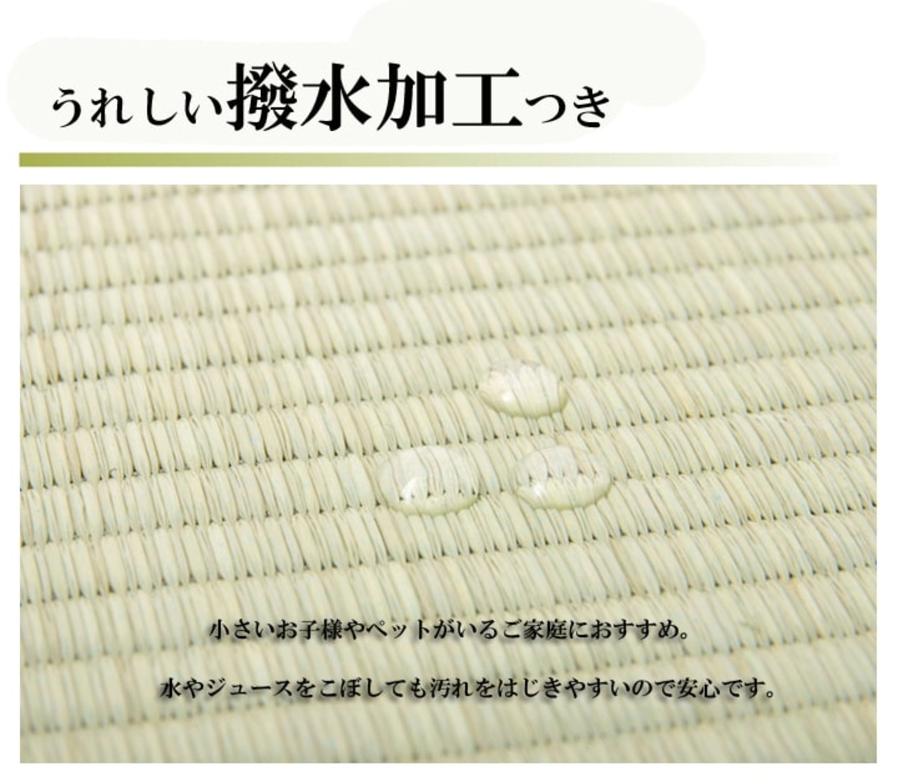 い草生地の両面に撥水加工を施した(ただし、お湯・お茶・コーヒーなど40℃以上の水分ははじきません)上敷です。上敷きを敷くだけで畳のお部屋をリフレッシュ出来ます。日焼けしてしまった畳のリフレッシュに、新品の畳を汚さない為のカバーにご使用下さい。一般的なイ草上敷はご使用の前に乾拭きが必要ですが、本商品は生地に泥染めをした上から撥水のコーティングをしているため、乾拭きの必要がありません。届いた商品を広げて頂いてそのままご使用頂けます。生地の表裏両面に撥水加工を施しています、両面使用可能で経済的なリバーシブルです。本商品は長さ105〜110cm程のイ草を使用しています。そのうち約88cmを使用しています。ヘリ際がある程度白みを帯びます。(日焼けではありません。い草の根元と先端部分の色です。)イ草は長いものほど高級になります。イ草は先端部分が赤茶色く、根元が白く真中が青(緑)色です。真中の良質な青の部分を多く使用するほど、丈夫で綺麗な仕上がりとなります。い草には空気の清浄作用、湿度の調節作用があり、汚れにくいといった特長があります。青森県のヒバの木から抽出した「ヒバエッセンス」をメーカー独自の技術で生地表面に加工しました。ヒバエッセンスにはヒノキチオールという、天然物物質としては極めて抗菌性の高い成分が含まれています。(無加工品に比べ抗菌、防臭効果があります。)※自然素材であること、また職人が一つ一つ手作業にて加工を行うため、形状のバラツキや表示サイズと多少異なることがあります。※撥水加工の工程上、イ草生地が若干赤みを帯びております。予めご了承頂きますようお願いします。