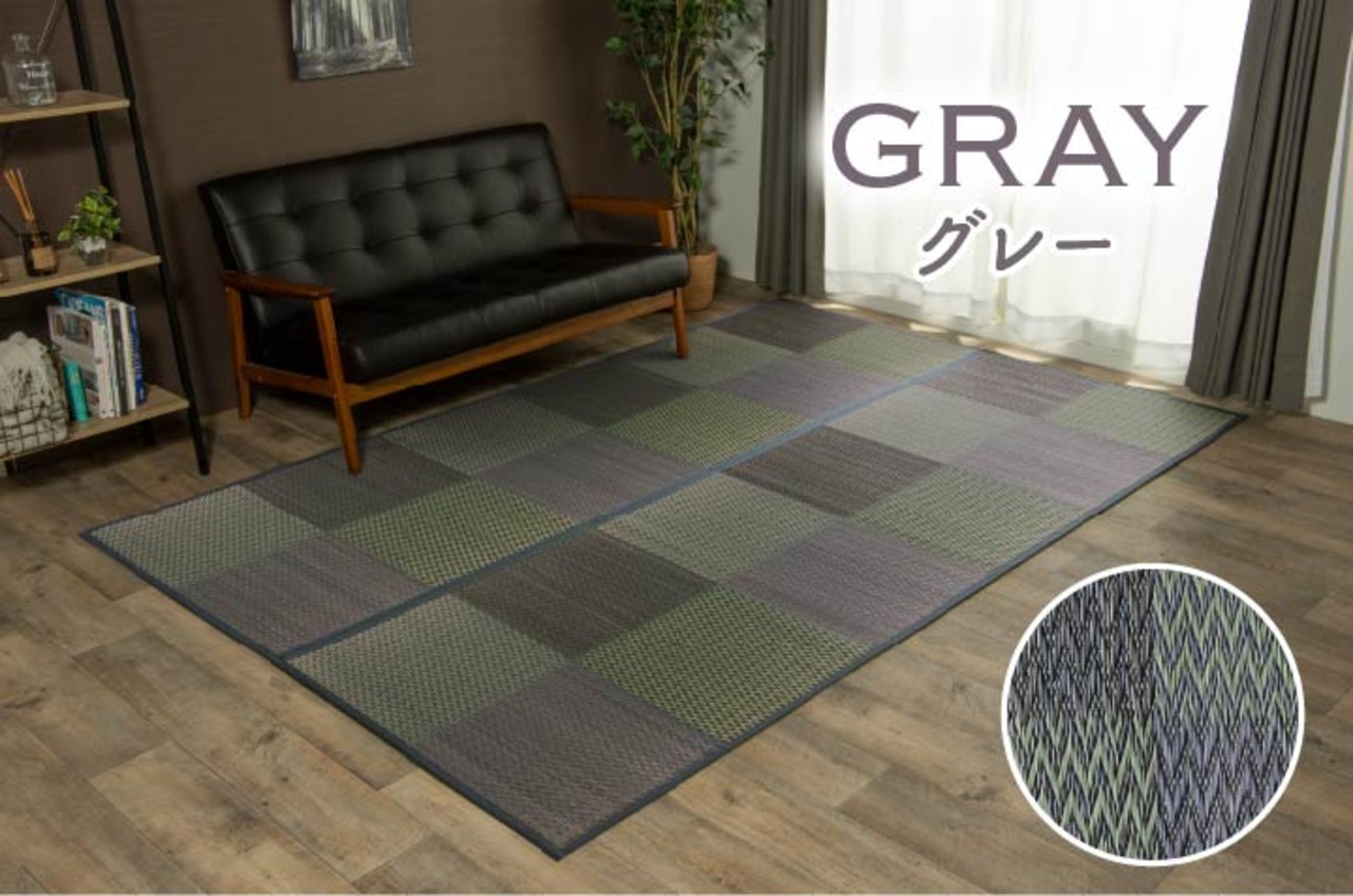 市松柄でシンプルなデザインに仕上げたイ草カーペットです。い草には空気の自然浄化作用、湿度の調節作用などがあり、汚れにくいという特長があります。フローリングを傷つけにくいよう、裏には不織布を貼っています。い草に青森ヒバ加工を施しています(抗菌・防臭効果)。青森県のヒバの木から抽出した「ヒバ油」をメーカー独自の技術で材料や商品に加工しました。「ヒバ油」には、ヒノキチオールという天然物質としては極めて抗菌性の高い成分が含まれ、医療や食品など多分野で利用研究が進められています。※自然素材であること、また職人が一つ一つ手作業にて加工を行うため、形状のバラつきや表示サイズと多少異なることがあります。ご了承下さい。