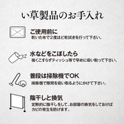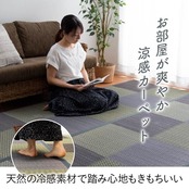 市松柄でシンプルなデザインに仕上げたイ草カーペットです。い草には空気の自然浄化作用、湿度の調節作用などがあり、汚れにくいという特長があります。フローリングを傷つけにくいよう、裏には不織布を貼っています。い草に青森ヒバ加工を施しています(抗菌・防臭効果)。青森県のヒバの木から抽出した「ヒバ油」をメーカー独自の技術で材料や商品に加工しました。「ヒバ油」には、ヒノキチオールという天然物質としては極めて抗菌性の高い成分が含まれ、医療や食品など多分野で利用研究が進められています。※自然素材であること、また職人が一つ一つ手作業にて加工を行うため、形状のバラつきや表示サイズと多少異なることがあります。ご了承下さい。