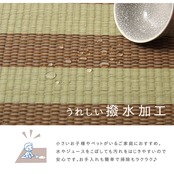 い草生地に撥水加工を施した(ただし、お湯・お茶・コーヒーなど40℃以上の水分ははじきません)イ草ラグカーペットです。中材にはクッション性にこだわり、ウレタン8mmを使用しています。クッション性、耐圧分散性に優れたウレタンをイ草と不織布でサンドしました。プニプニとして柔らかく、フローリングのお部屋に最適な商品です。フローリングを傷つけないよう、裏には不織布を貼っています。い草には空気の自然浄化作用、湿度の調節作用などがあり、汚れにくいという特長があります。い草に青森ヒバ加工を施しています(抗菌・防臭効果)。青森県のヒバの木から抽出した「ヒバ油」をメーカー独自の技術で材料や商品に加工しました。「ヒバ油」には、ヒノキチオールという天然物質としては極めて抗菌性の高い成分が含まれ、医療や食品など多分野で利用研究が進められています。※自然素材であること、また職人が一つ一つ手作業にて加工を行うため、形状のバラつきや表示サイズと多少異なることがあります。ご了承下さい。